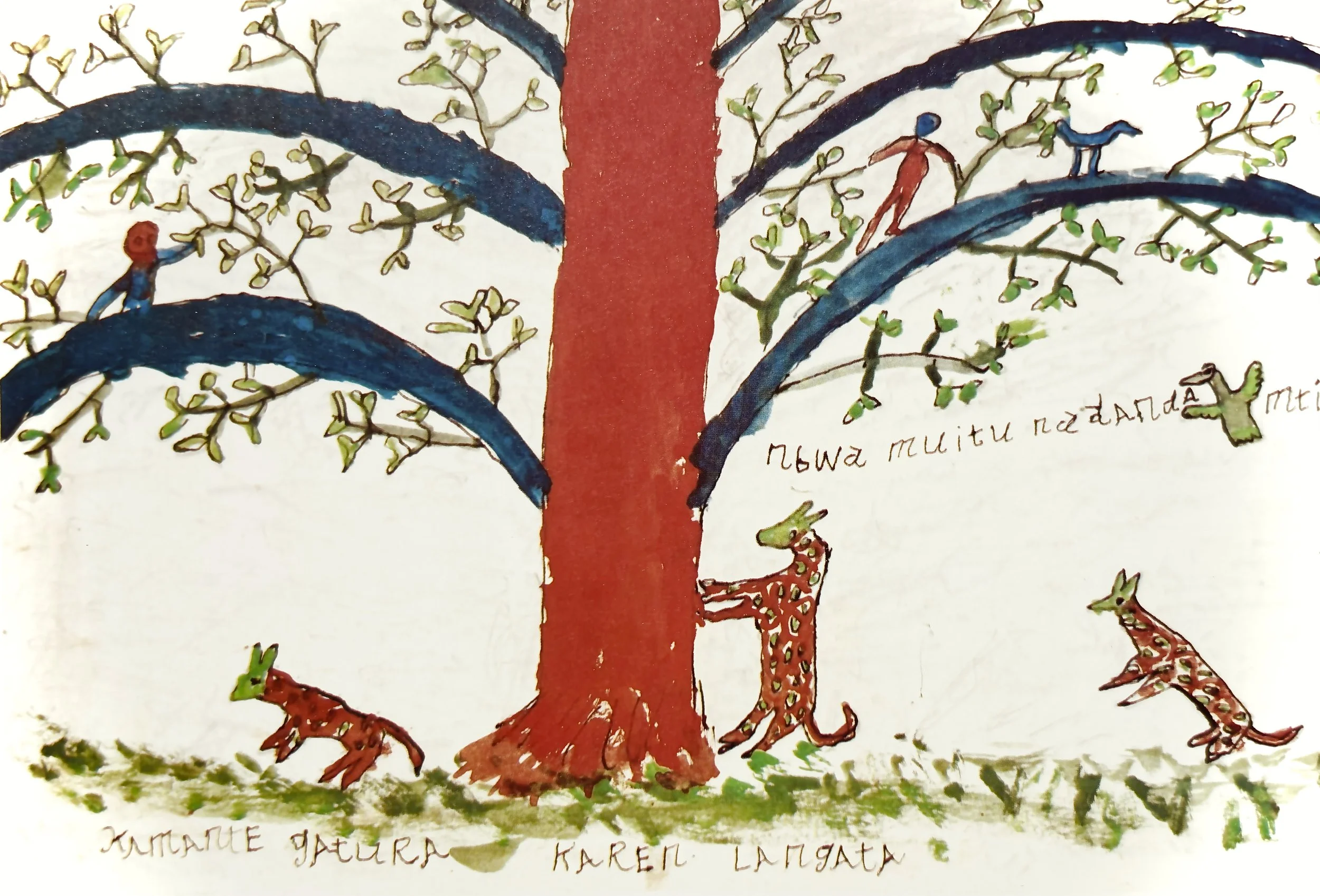 アフリカの人カマンテの眼にうつる、もうひとつの現実と、カレンの逞しい日常(家の外壁に大きな時計を取りつけたという逸話も)。紙いっぱいに描かれたシマウマ、猿とドルフィン、兎と亀、昆虫たちが織りなす、日常と幻想。ワニやチーターが牙をむいた、すさまじい場面。