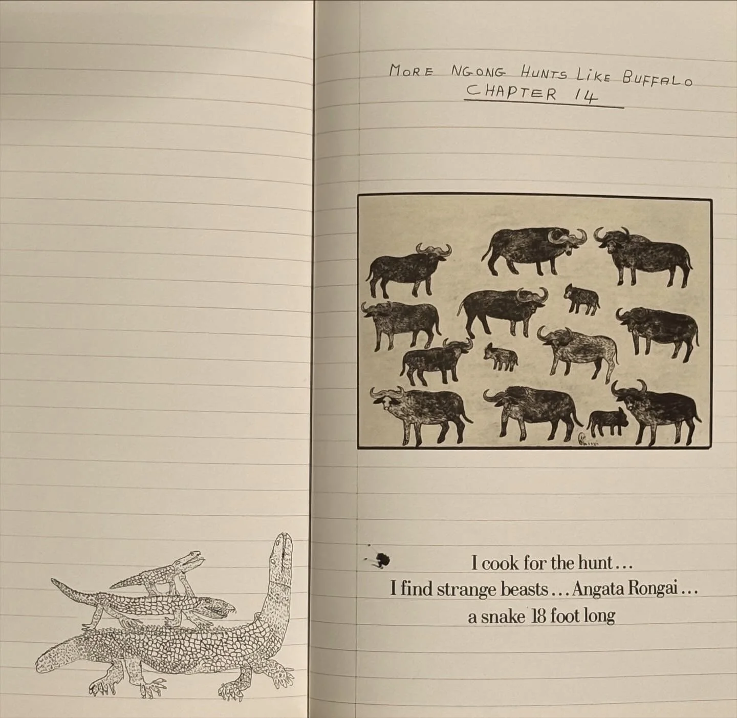 いずれ『バベットの晩餐会』を著す、カレンの家で、料理を担当していたカマンテが、スワヒリ語で思い出を語った、その聞き語りからの翻訳文を生かした、スクラップブックというかたち。セピア調の写真と手書き文字に、イラストレーションを添えるコラージュのスタイルは、ビアードのアートブック(#journaladdictとタグづけしたくなる)にも通ずるもの。